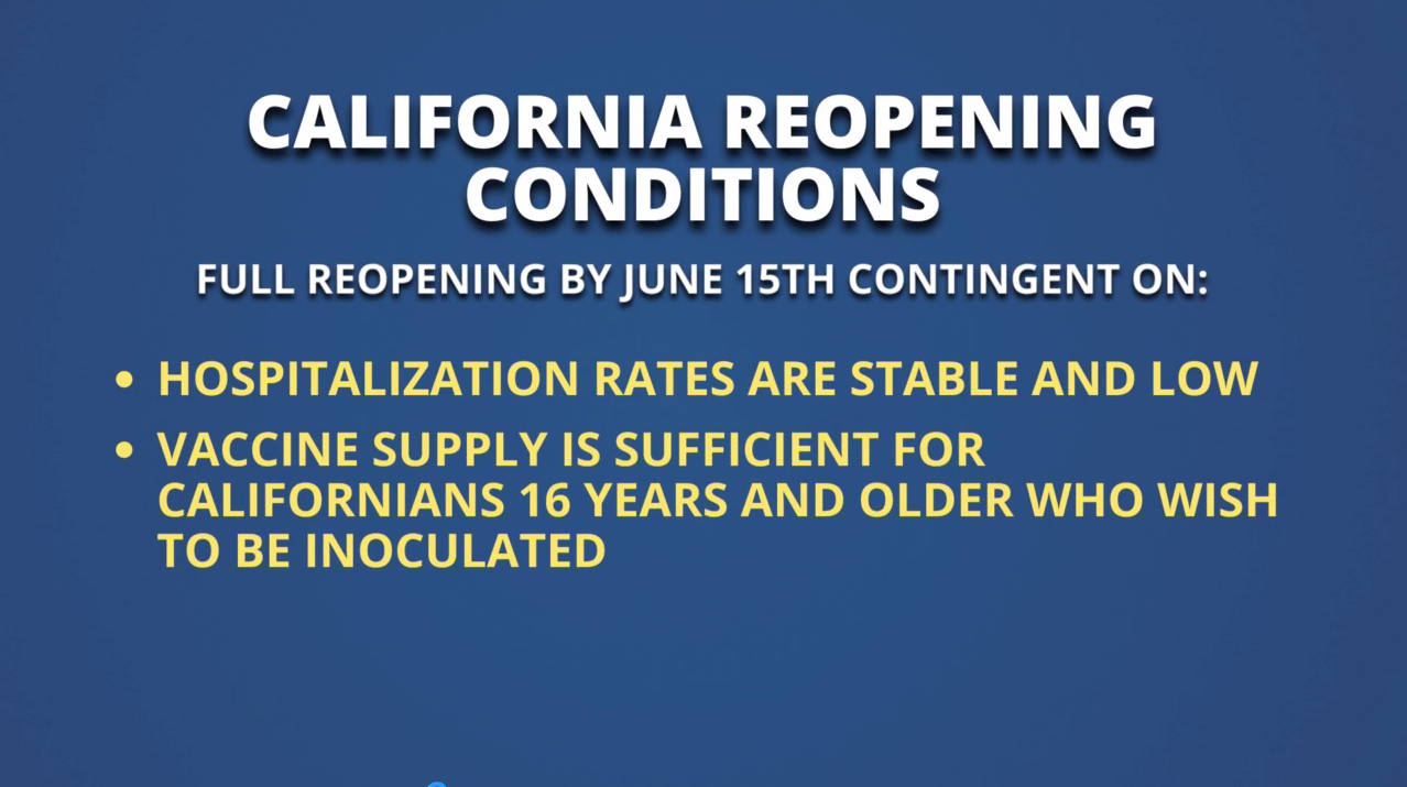 Newsom announced that the light at the end of the tunnel could come on June 15 if certain requirements are met. According to the governor, California's economy could fully reopen on June 15 if the state's vaccine supply is adequate for residents 16 and older who wish to be vaccinated to be inoculated, and if hospitalization rates are stable and low.