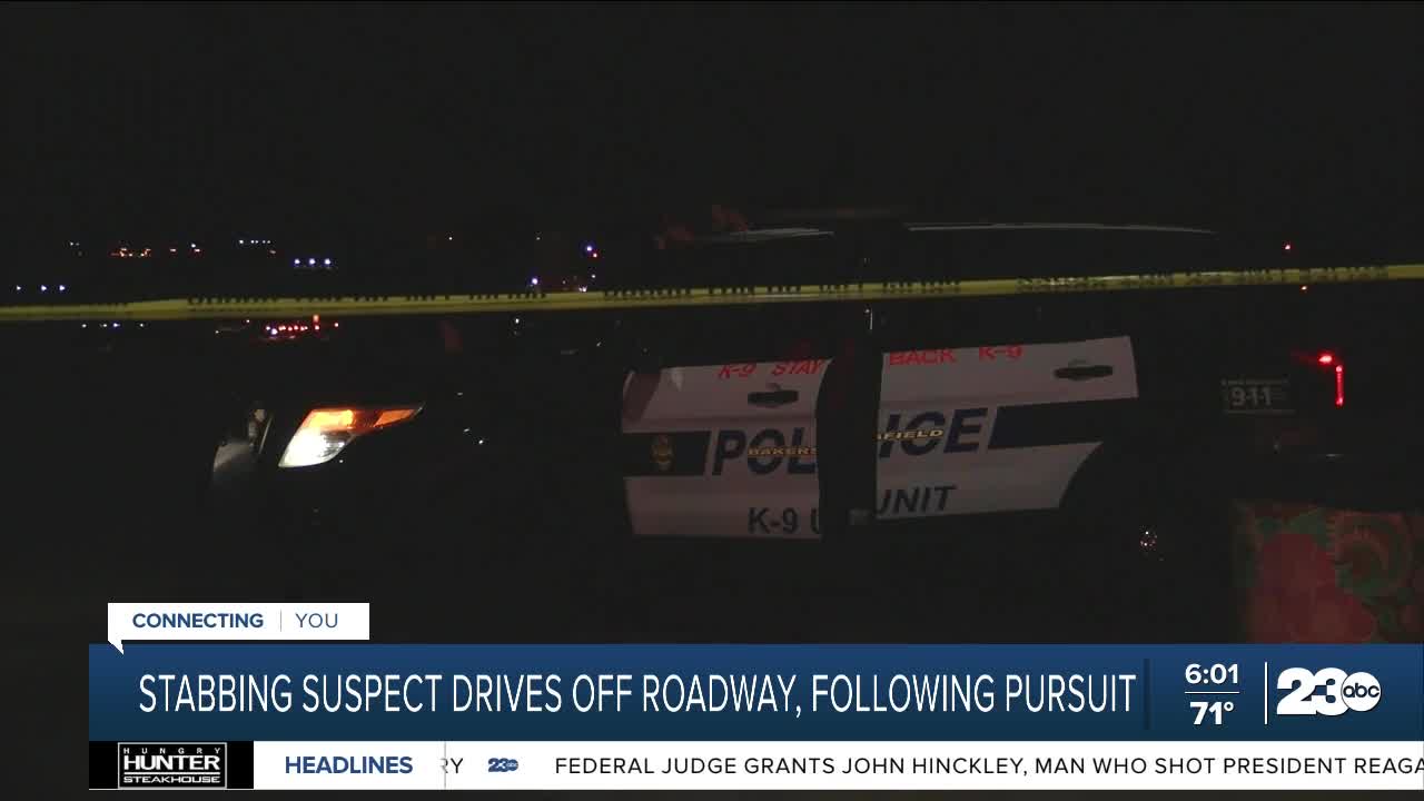 The Bakersfield Police Department said a stabbing suspect led police on a short chase Wednesday night and ended up driving off the road.
