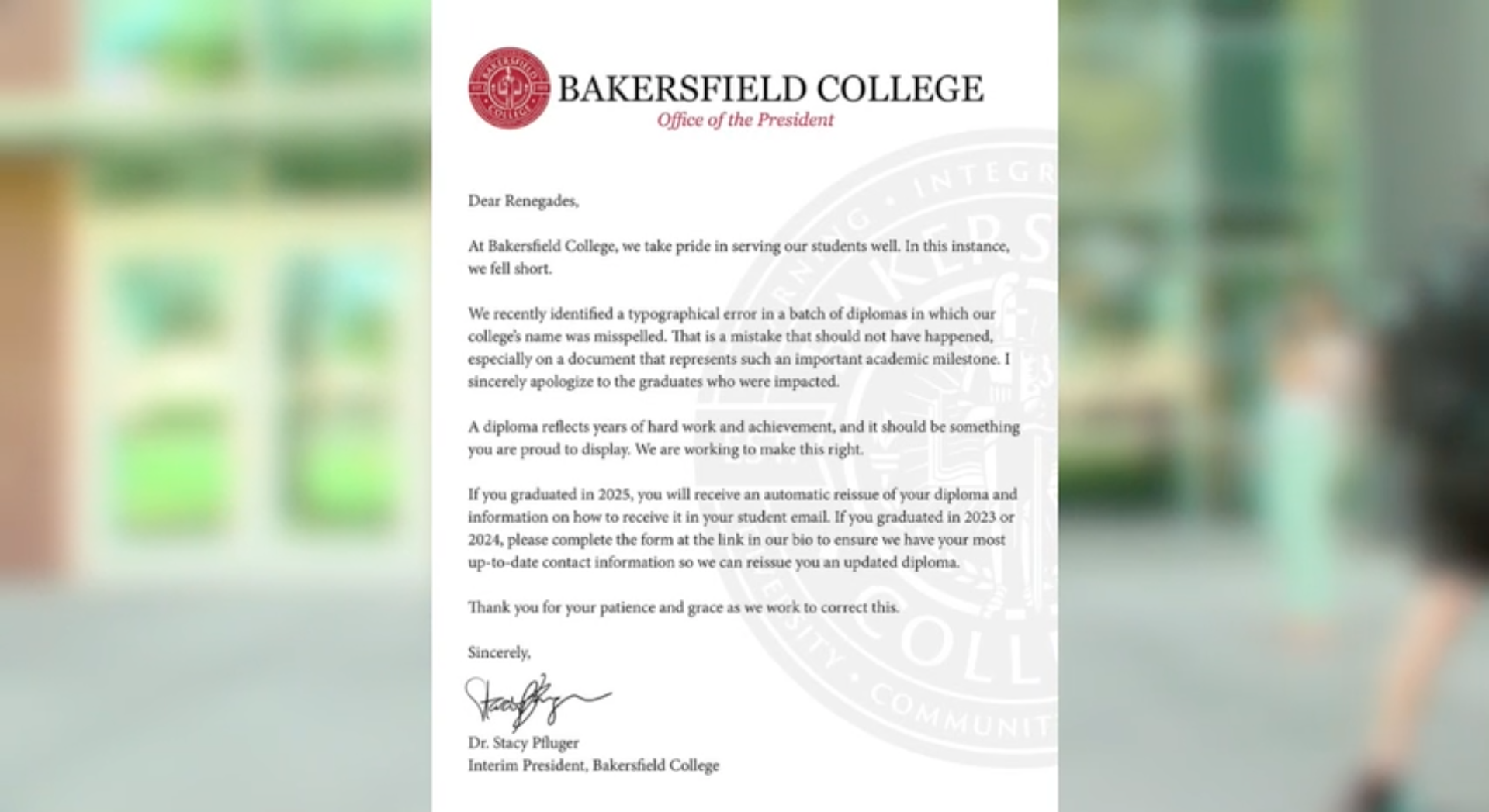 BAKERSFIELD, Calif. (KERO) — Bakersfield College is reissuing diplomas after interim President Dr. Stacy Pfluger says the college's name was misspelled on the documents.