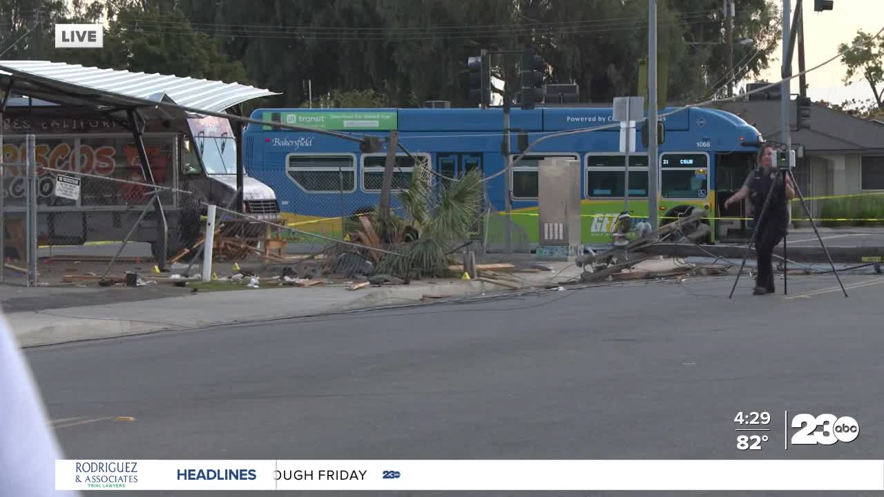 Bakersfield Police responded to East California Avenue at approximately 12:09 p.m. for a major injury collision. Officers determined that a black Nissan pickup truck traveling westbound on East California Avenue veered northbound from the roadway for unknown reasons, drove through fencing and into a parking lot on the northeast corner where a food truck was set up.