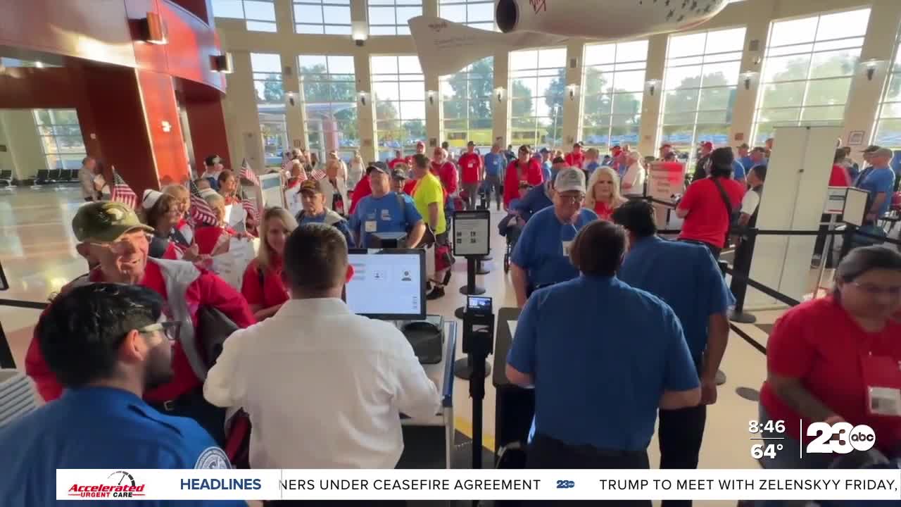 BAKERSFIELD, Calif. (KERO) — Honor Flight 52 has arrived in Washington, DC. I'm Mike Hart, your senior reporter. A long day of travel on a charter flight from Allegiant Air from Bakersfield to Baltimore, landing in the rain and cold, then a long drive into our nation's capital to get geared up for a full day of activities tomorrow.