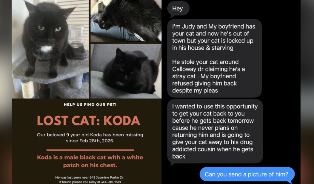 After my cat, Koda, went missing, I posted a flyer to several lost and found pet pages on Facebook. Shortly after, I began receiving texts from people claiming to have found him. All of them turned out to be scammers.