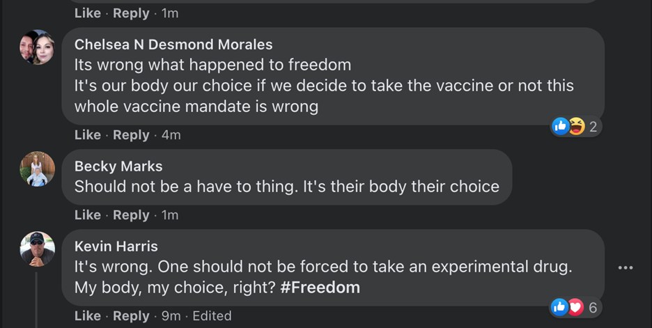 On Facebook, Chelsea Morales says: “It’s wrong. What happened to freedom? It’s our body our choice if we decide to take the vaccine or not this whole vaccine mandate is wrong.”