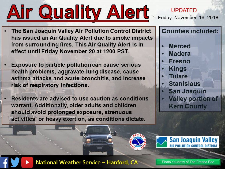 The San Joaquin Valley Air Pollution Control District has extended an Air Quality Alert due to smoke impacts from surrounding wildfires for most of Central Interior CA. This Air Quality Alert is now in effect through 1200 PST November 20th, 2018. #cawx #casmoke #cafires pic.twitter.com/7ybIwhRXO6