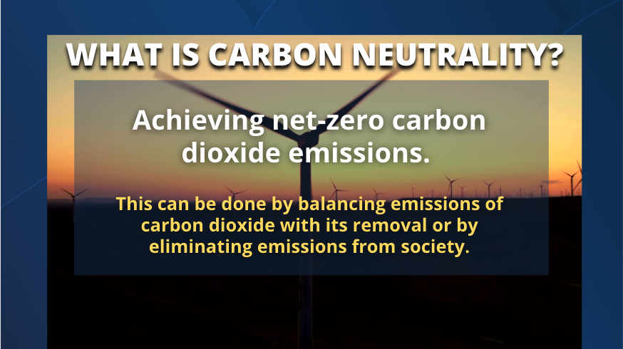Carbon neutrality refers to achieving net-zero carbon dioxide emissions. This can be done by balancing emissions of carbon dioxide with its removal or by eliminating emissions from society.