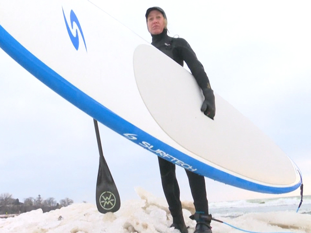 Surfers ignore lake's sub-freezing temperatures
