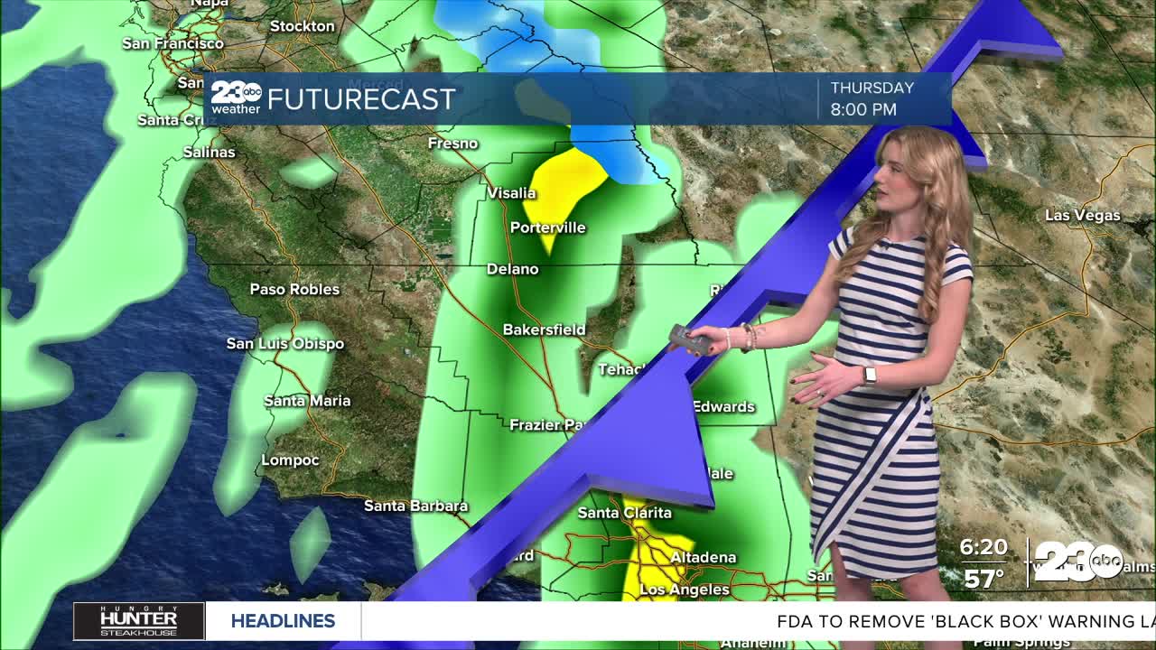 Big changes arrive later this week. A storm system drops into California on Wednesday, and rain is set to arrive in Kern by Thursday. Latest models show the strongest push of rain Thursday night into Friday. Lingering showers and thunderstorms are possible through the day Friday, and most activity clears through Saturday.