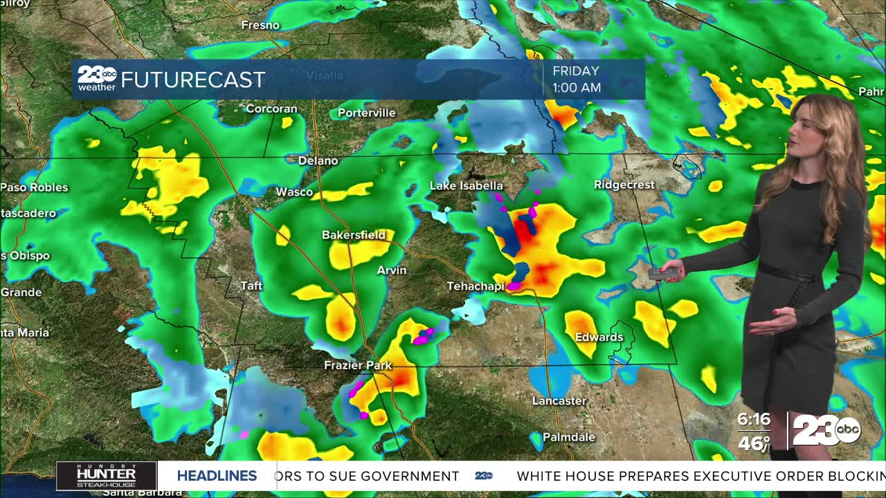 Eastern Kern County gets another round of showers Friday. Models favor the desert for the highest rain totals, with 1" to 1.5" inches of rain possible in Mojave, California City and Ridgecrest. Bakersfield and the surrounding valley neighborhoods are set to receive between 0.25-0.75" of rain.