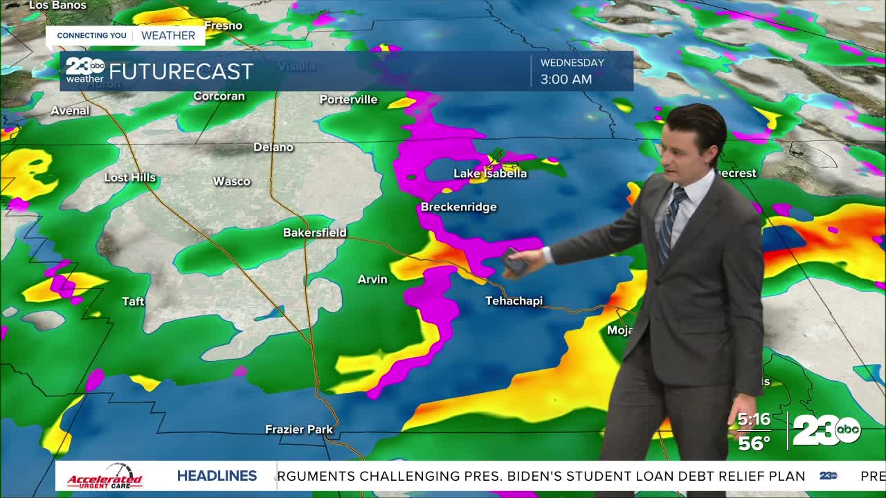 The storm has already arrived in Kern County Tuesday evening, bringing light rain and mountain snow.