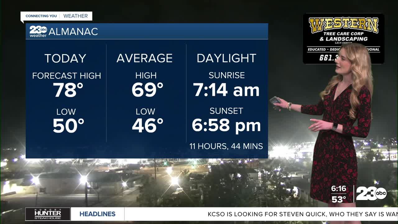 Bakersfield is one of the warmest spots today with a forecast high of 78 degrees. The KRV will warm to the low-to-mid-70s, 60s in the mountains, and 70s throughout the desert.