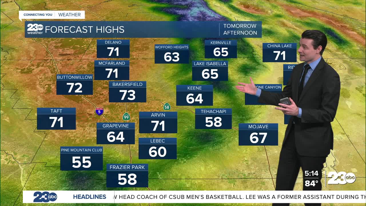Highs in the Valley and desert will be in the lower 70s, with 50s and 60s for the mountains and the KRV.
