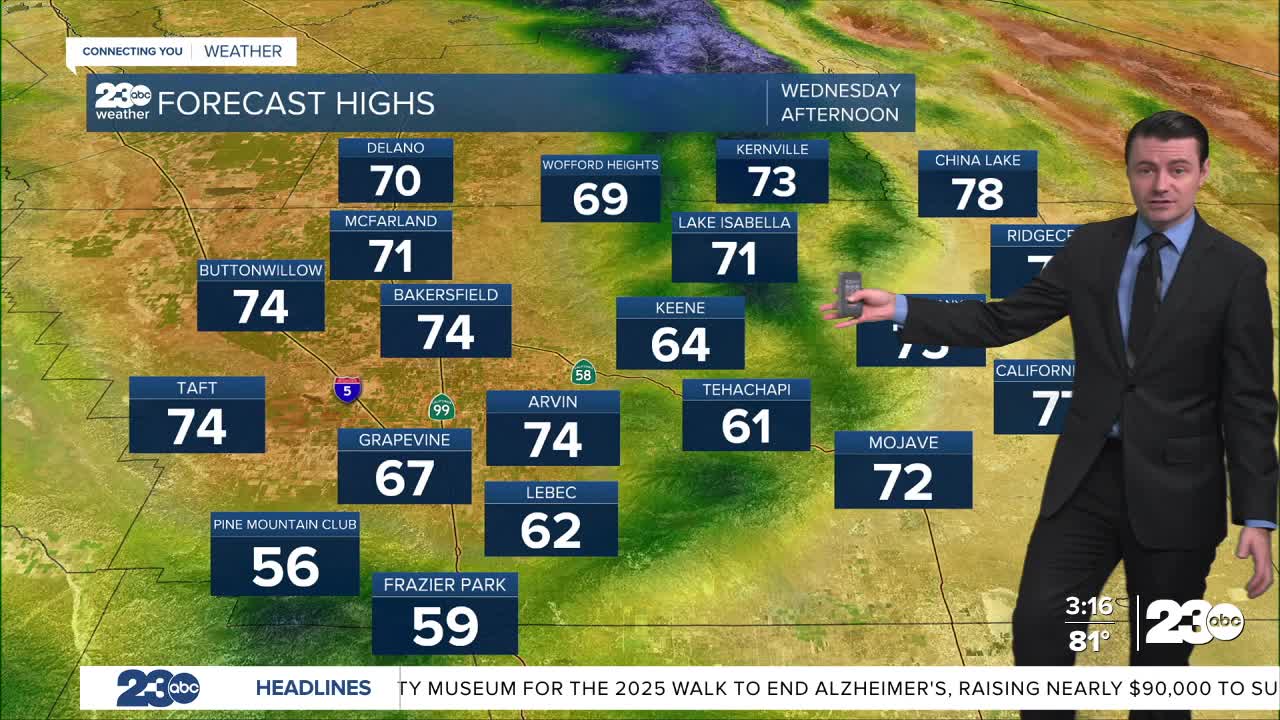 We're not expecting much of change for Tuesday, either, with highs primarily in the 70s and 80s across Kern.