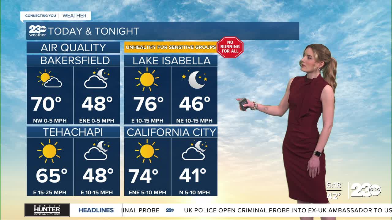 Afternoon highs on Wednesday will be in the 60s and 70s, above average for this time of year. Bakersfield expects a high of 70, mid-60s in the mountains, and 70s in the KRV and desert.