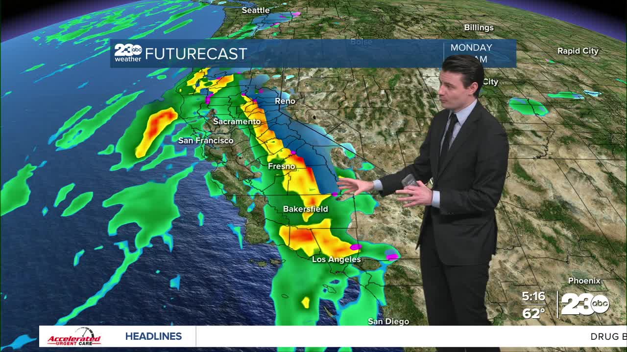 Showers start up in Kern late Sunday night, and become widespread early Monday.