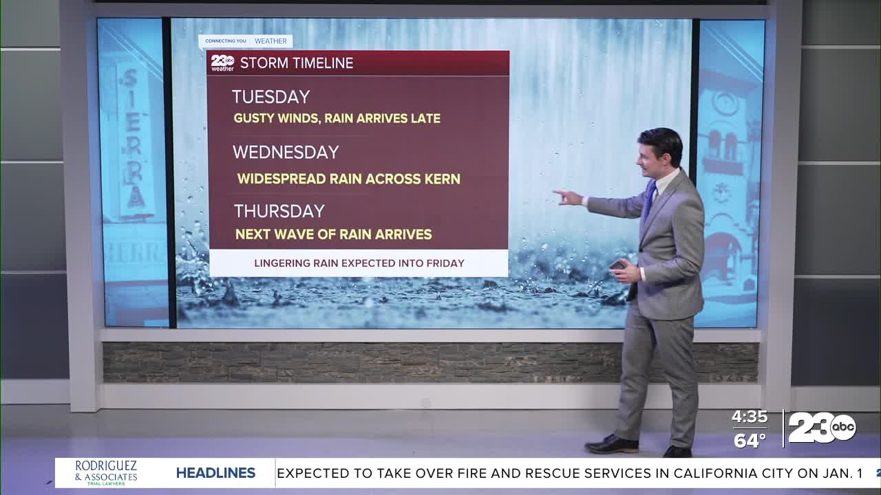 Rain will start up in mountain areas by Tuesday evening, and become widespread across Kern late Tuesday night into Wednesday morning.