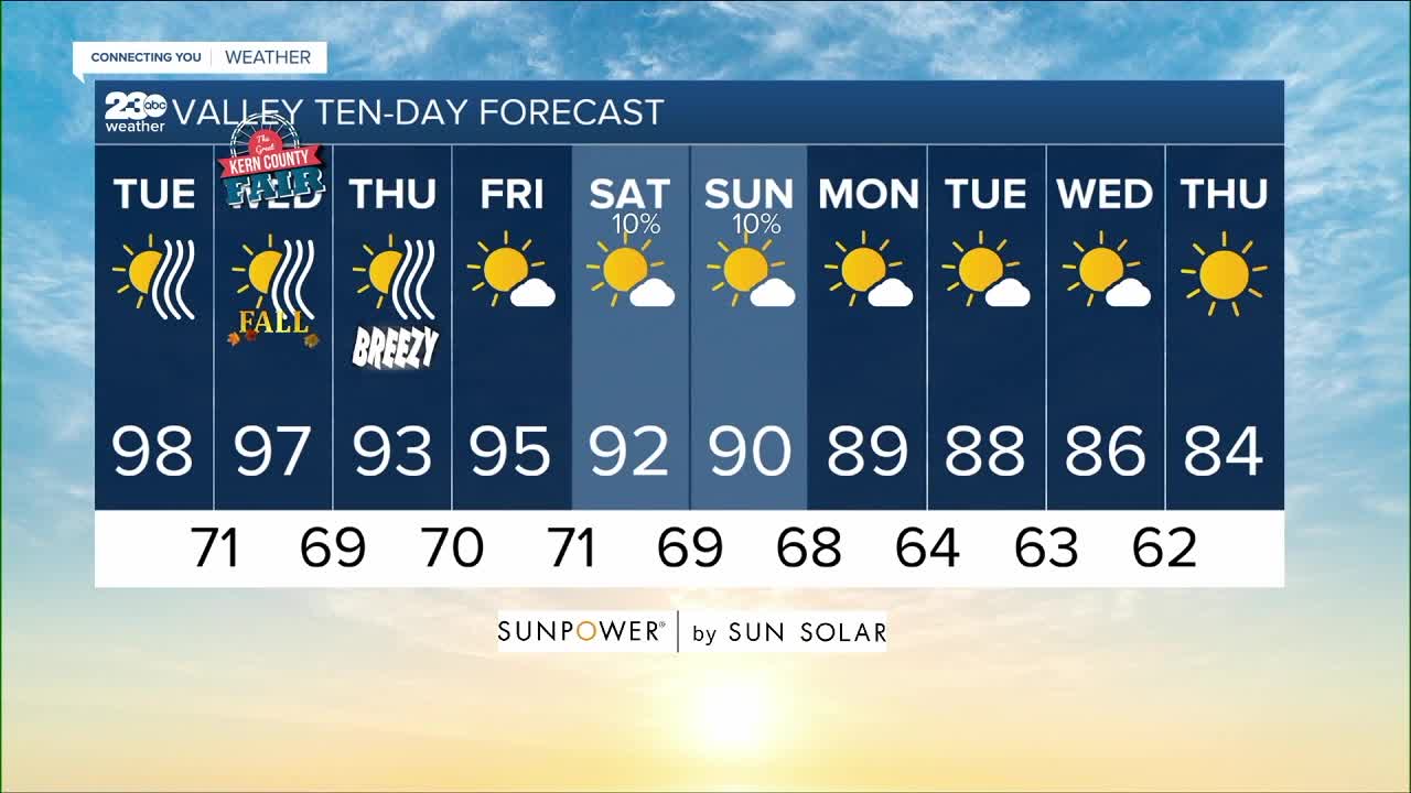 BAKERSFIELD, Calif. — It's the last day of Summer on the calendar and it feels like it, with a forecast high of 98 in Bakersfield today and trapped wildfire smoke.