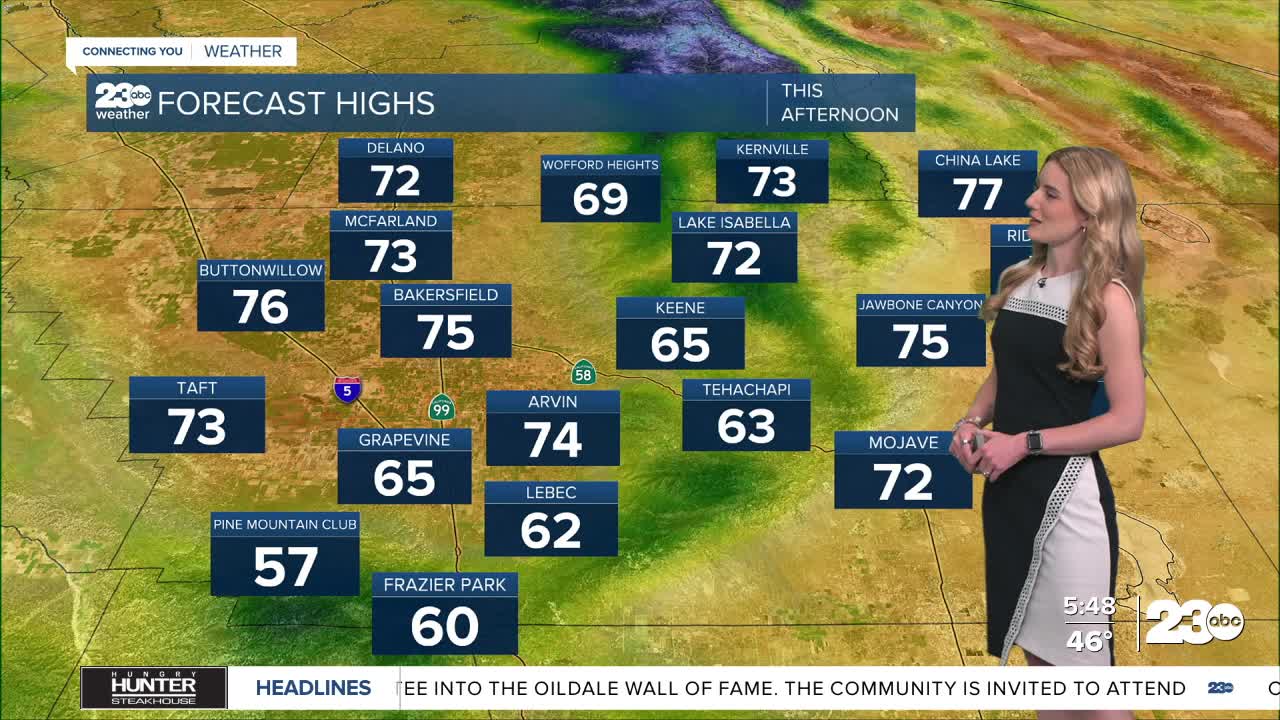 Afternoon temperatures will be mild in all of our neighborhoods. Bakersfield has a forecast high of 75 degrees on Tuesday. 60s and 70s are expected in the KRV, low-60s in the mountains, and 70s across the board in the desert.