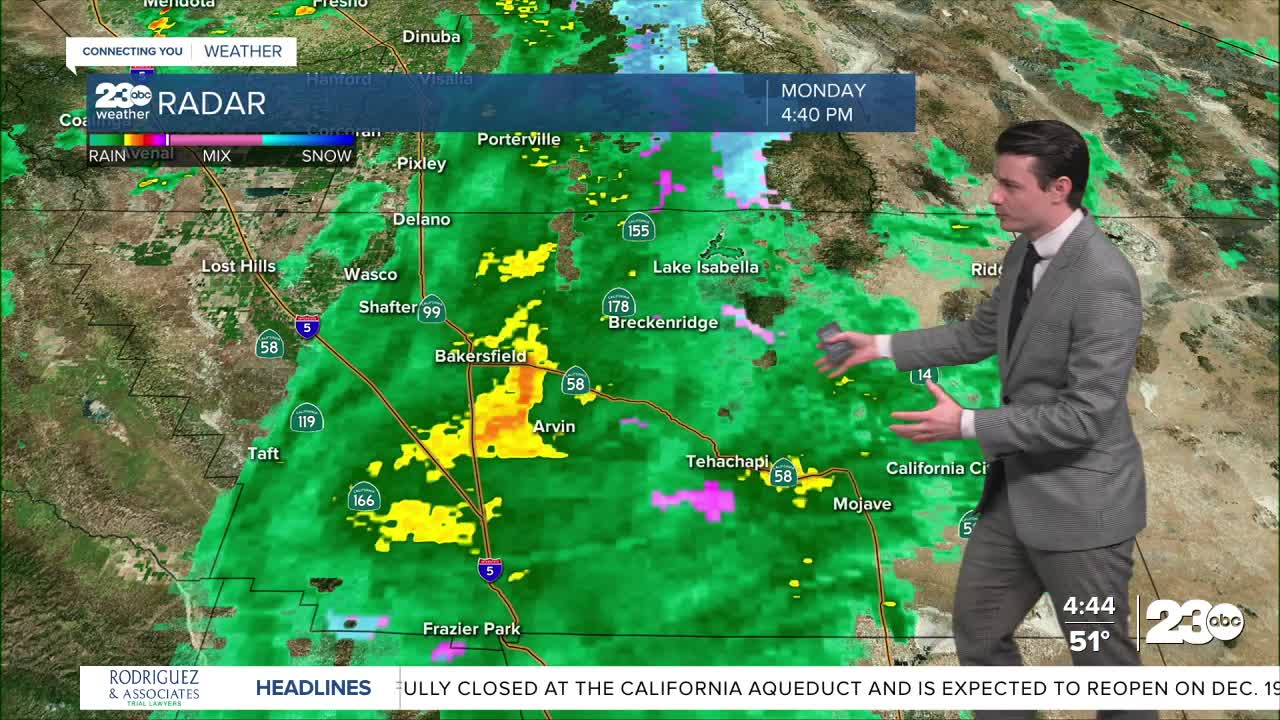 The heavier rain band moving through Kern Monday is expected to move east through the evening, but lingering lighter showers are possible off and on through Monday night, and even into the day on Tuesday.