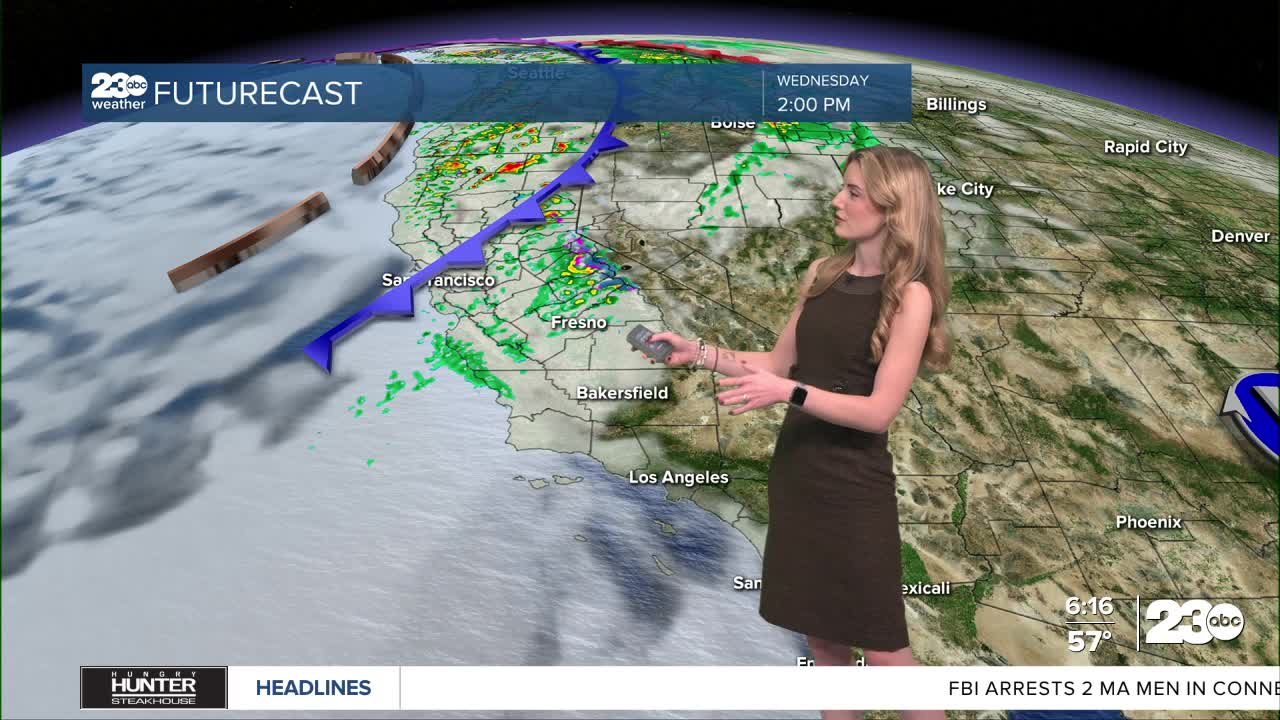 As this storm progresses into the central valley, the rainfall becomes much more scattered. Essentially, it loses steam as it moves, and by the time it reaches Kern, the rain chances fall to nearly zero. A stray light shower or two is possible late Wednesday through early Thursday, but again, widespread rain is not expected.
