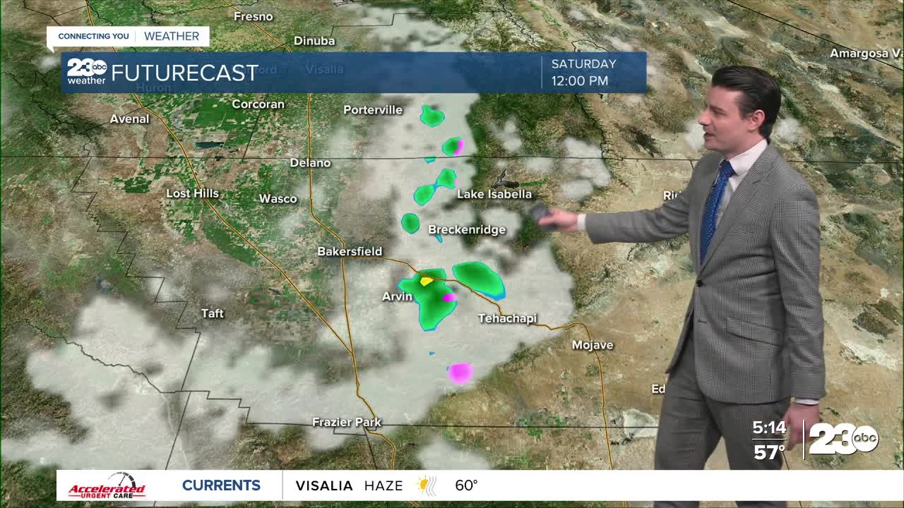 Showers and storms are still lingering in Kern Friday night, and a bit of mountain snow is possible, too.