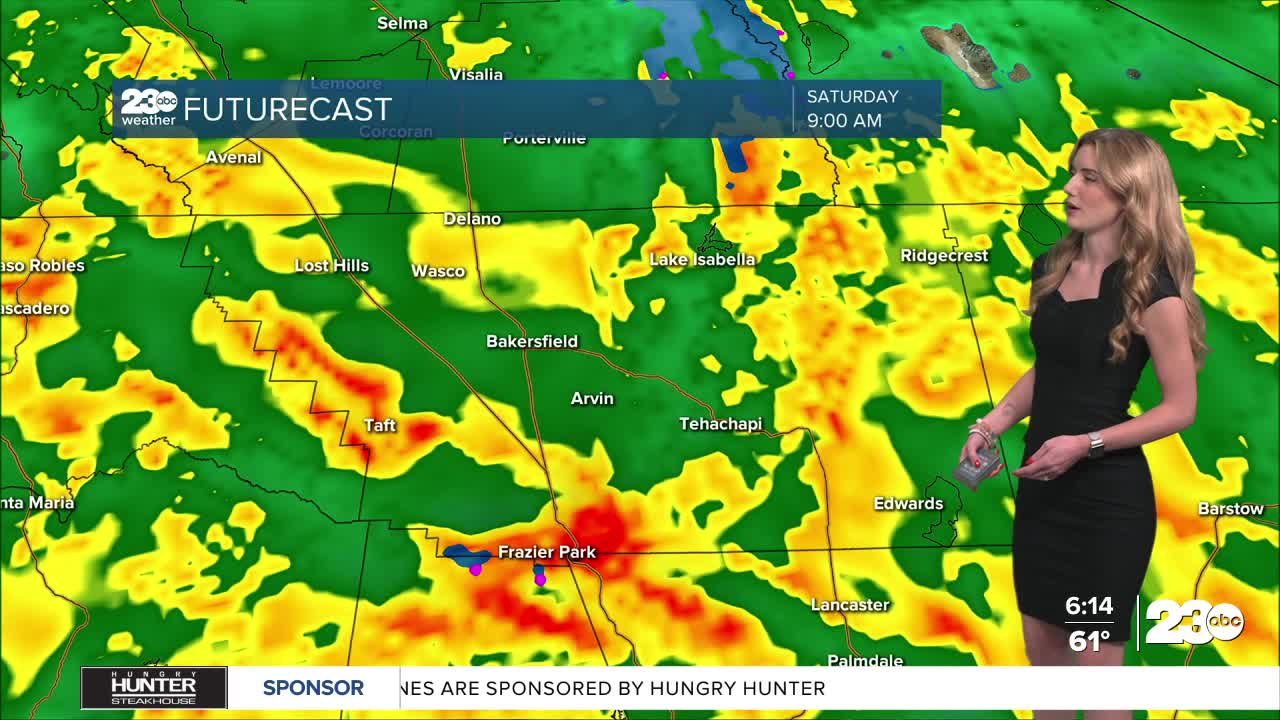A strong band of moisture wraps around an area of low pressure Saturday, and that's sending rain into Kern. The wee hours of Saturday morning bring the first push of heavier rain, and then as you're waking up Saturday morning, expect widespread showers and isolated thunderstorms.