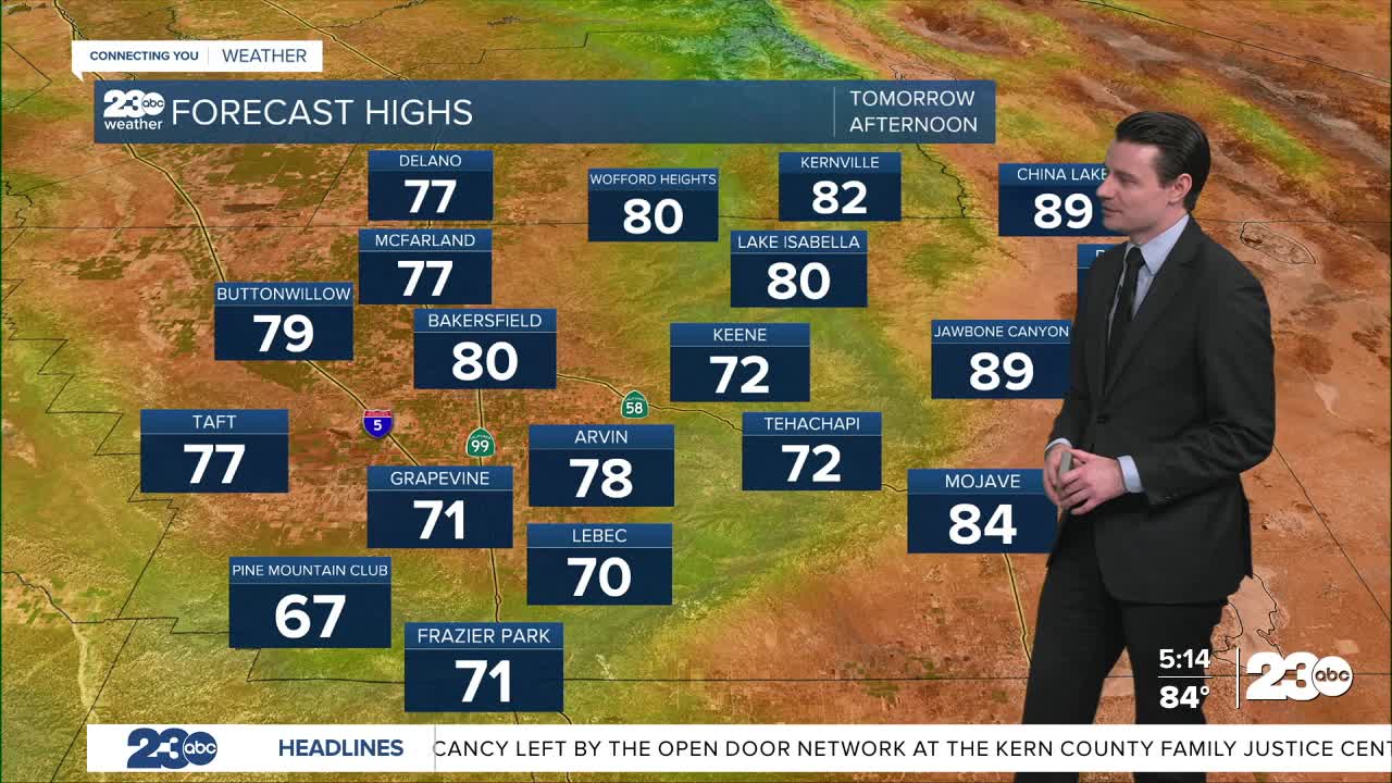 For Thursday Valley areas will be in the upper 70s to right around 80°, mountain towns will be near 70°, and desert areas will still be warm, near 90°.
