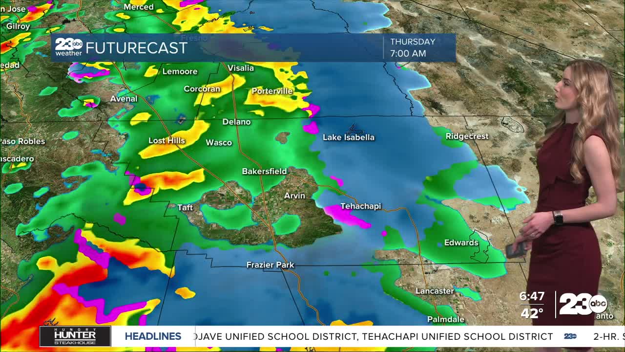 Another wave of rain and snow is set to arrive here in Kern Thursday morning. The valley will likely have another round of widespread rain showers, and we do expect it to be cold enough Thursday to see additional snow fall at the pass level on the 5 and 58.