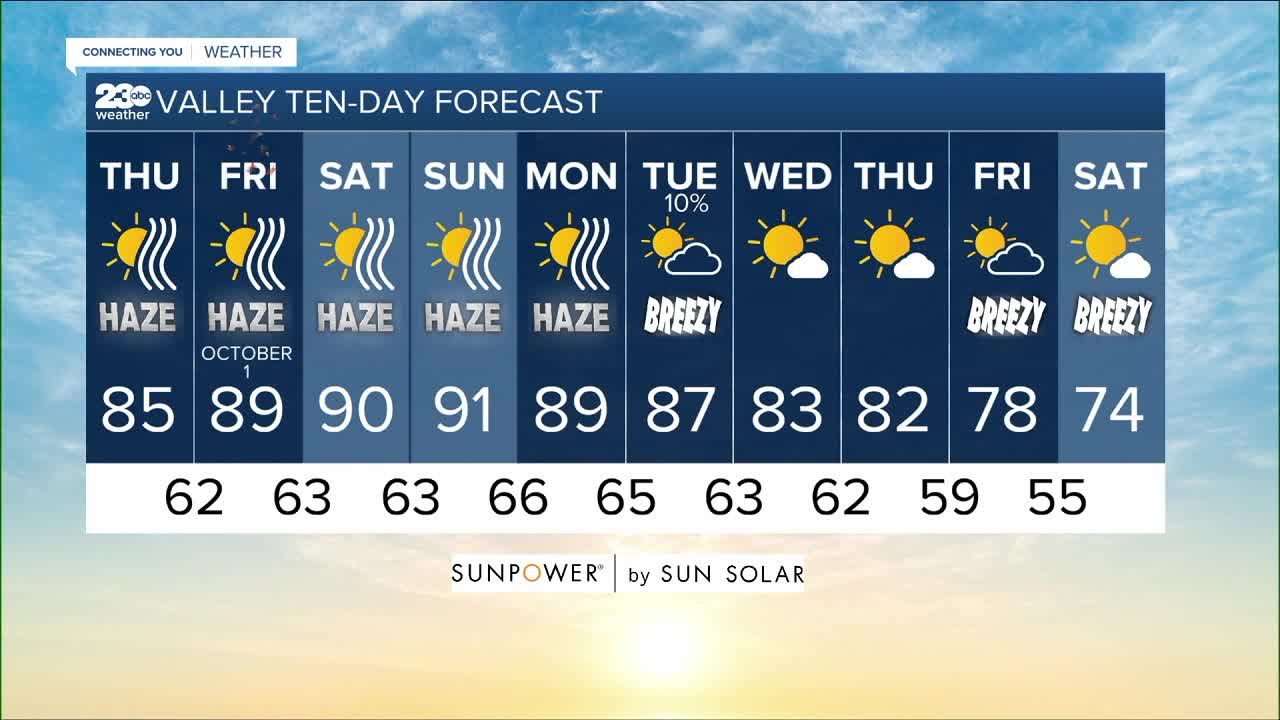 That means a jump back to seasonal mid-80s in the valley, Kern River Valley and Kern Desert today with warming as we head into the weekend. Unfortunately that also means a return to the haze, as smog becomes trapped in the valley once again with dense wildfire smoke filling in from the Sequoia National Forest. So the air quality in the valley is forecast to be in the moderate range today, but gets worse day by day through the weekend, especially for the Kern River Valley.