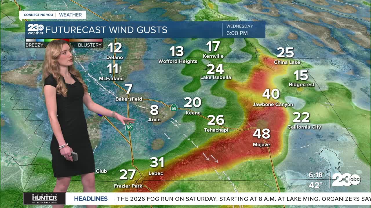 Before winds pick up this afternoon, we're monitoring visibility impacts on your Wednesday commute. A dense fog advisory is active in the valley until 11 a.m., though low clouds banked up against the mountains could cause limited visibility through the Tehachapi area, or the south mountains along the Grapevine. Drive with caution in case you encounter patches of fog.