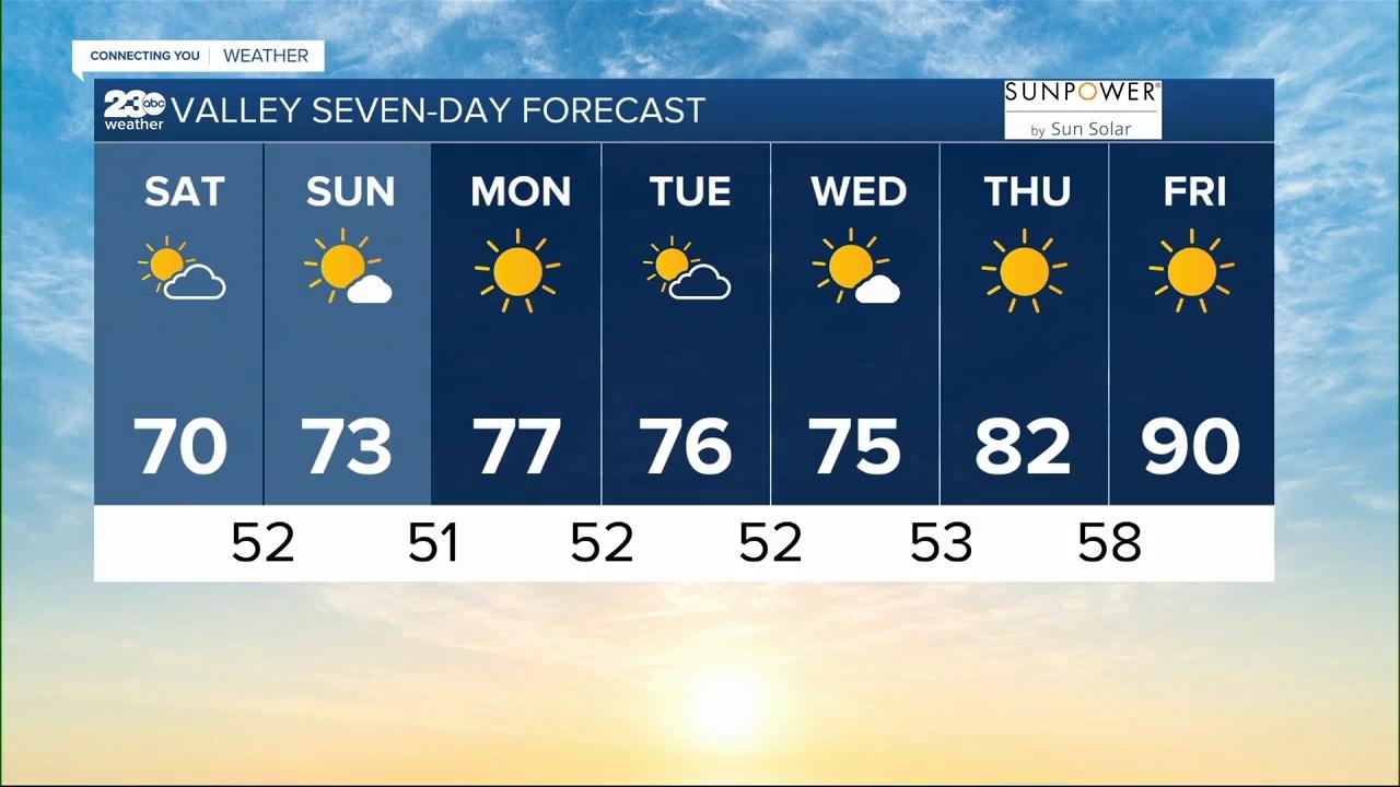 For today Bakersfield you’ll see a high of 70°, with similar temperatures for the rest of our Valley communities .