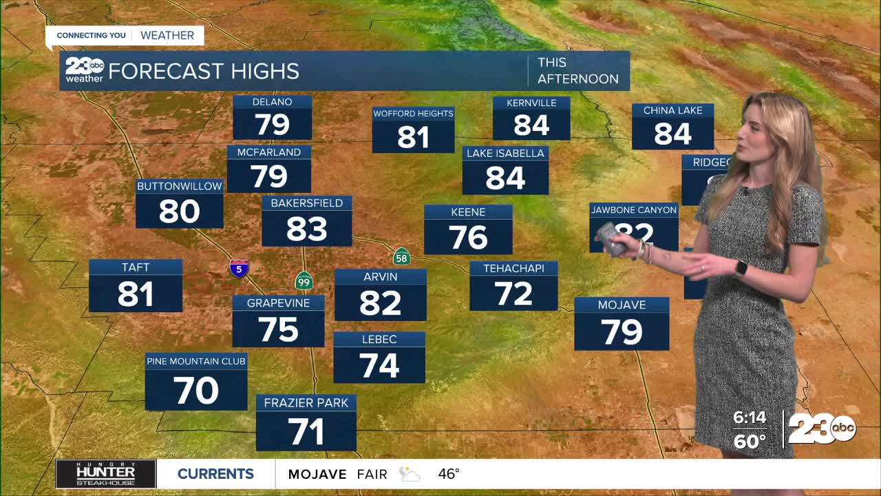 Monday's afternoon high temperatures will be in the low-to-mid-80s for the valley, KRV and desert, and low-70s in the mountains. Calm winds are expected into the day, with breezy spots possible in the mountains.