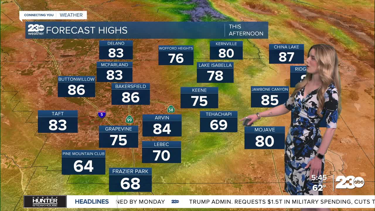 Good morning and happy Monday, Kern County. Temperatures stay above average for the first half of the week before our weather pattern shifts heading into next weekend.