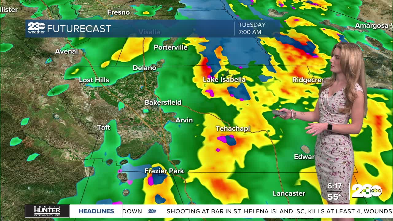 The first rain showers could enter Kern late Monday afternoon. Then, widespread rain and storms are likely late Monday evening through Tuesday morning. Rain totals range from 0.50" to 1.00" in the Valley, 0.75" to 1.5" in mountain areas, and 0.25" to 0.50" in the desert.