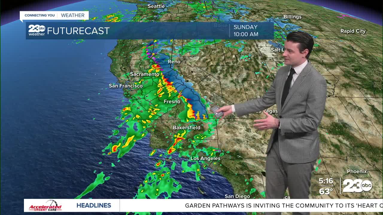 Scattered showers and possibly a thunderstorm or two are expected to move into Kern by Saturday morning and linger into the afternoon.